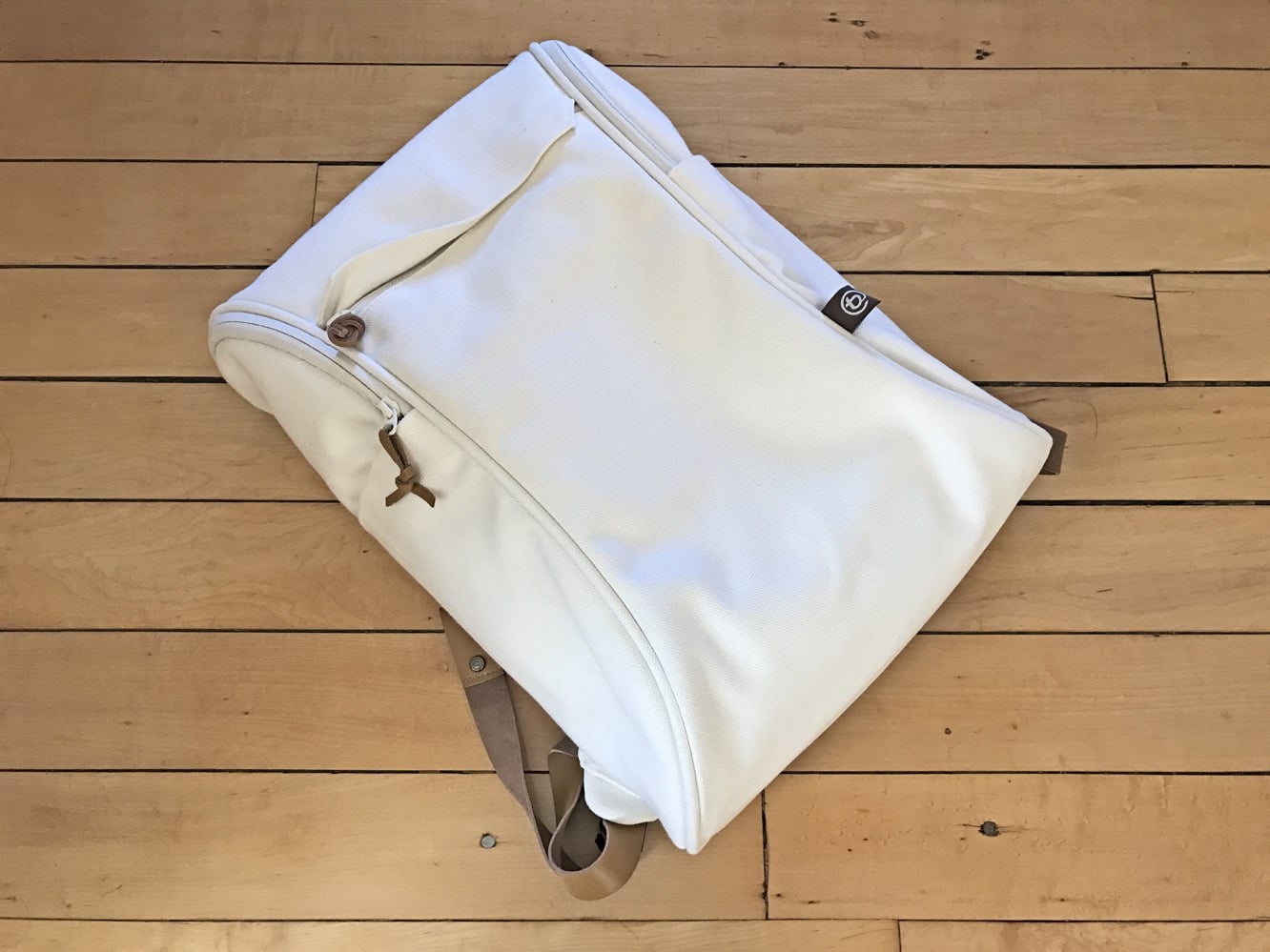 The cotton canvas exterior is water-repellent, and polyester lines the inside. We received the white “cream-dream” color option, but there are also gray, navy, and tan “clay” versions of Daypack, all with their own unique inner lining colors.