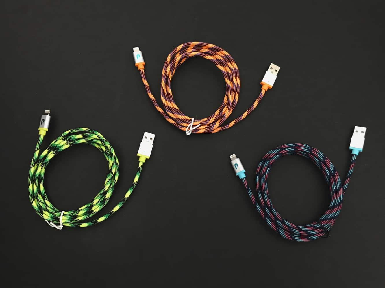 Beyond the designs, all of cables are otherwise identical in construction, constructed from 21 AWG power and 28 AWG data wires sheathed in aluminum and copper mesh EMF shielding and wrapped in durable “32-bit” paracord fabric and certified for a full-speed charging rate with durable aluminum housings on each end.