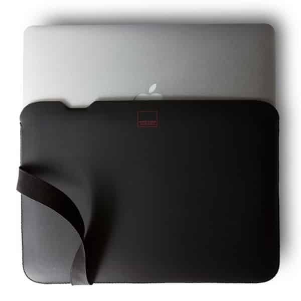 Skinny Sleeve is designed with two soft, slightly stretchy pads that are reinforced at the seam. They’re made to be super thin so that your encased Air doesn’t take up much more room in your bag than it would naked. And they’re water and stain repellent, just in case. An elastic band is sewn in to make sure that your computer doesn’t go sliding around in your bag even if it gets flipped around.