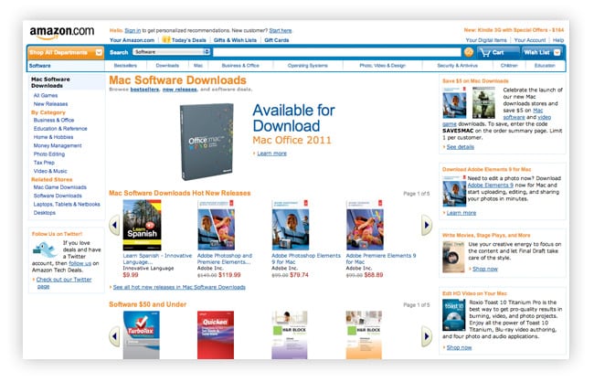 It may be a little early for the Mac App Store to start shaking in its boots, but Amazon has launched its own competing service, the Mac Download Store. Split into software and game sections, the browser-based store is starting with around 250 titles, and Amazon’s offering a couple of specials: $5 off of your first paid download through June 1, and a completely free copy of Airport Mania: First Flight.
