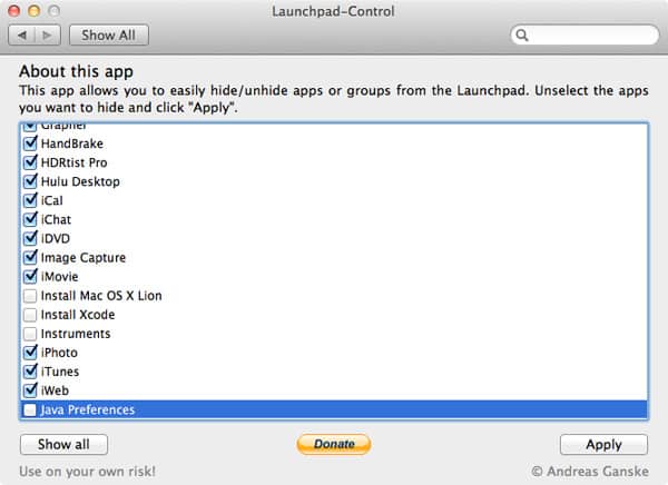 We want to like Lion’s new Launchpad, we really do. But the fact that every single app on your Mac shows up there—with no way to remove most of them—takes away from the experience. After all, how often is the average person going to use ColorSync Utility? Thankfully, German developer Andreas Ganske has released Launchpad-Control (Free) as a solution to that problem.