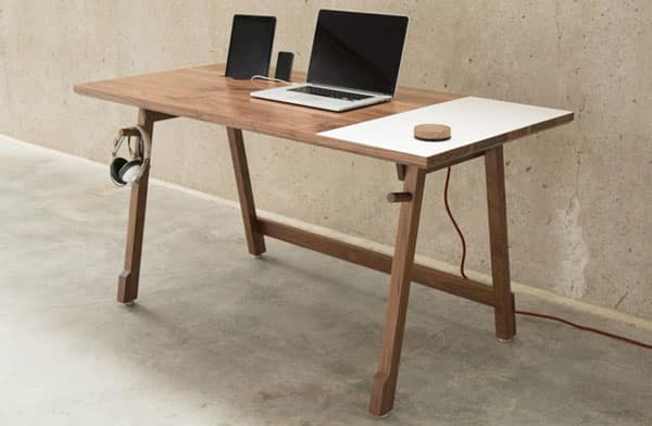 Made of solid hardwood, the desk has some truly neat features. Like iSkelter’s desk, there’s a tablet/phone slot, and you can string cables through to keep your devices charged. There’s also a hidden drawer for a powerstrip, allowing for clean cable management.