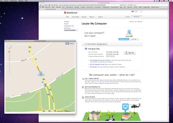 If your computer is ever lost or stolen, just log into the Backblaze site and it will not only show you the last time it was online, but also the IP address and even a map of the current location.