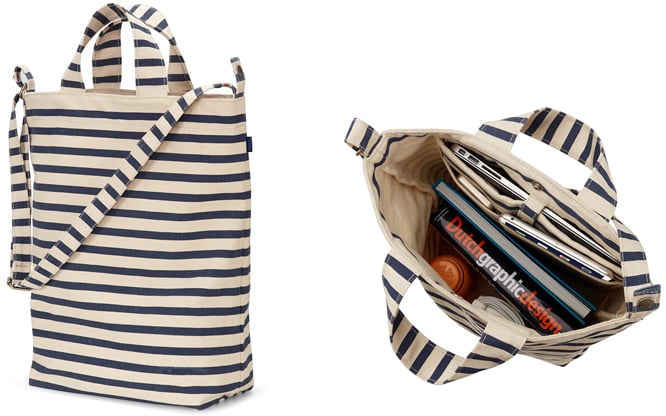 It can either be carried by its handles, or worn across the shoulder or chest with its 40” adjustable strap. We like the beige and navy horizontal stripe pattern best, but the red and black bags look quite nice too.