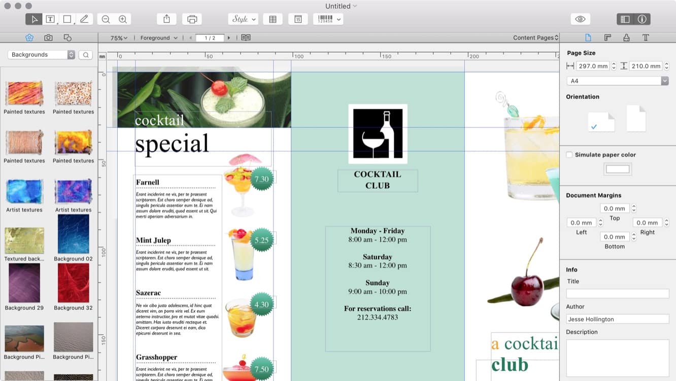 Sophisticated column layouts, text styles, and gradient and freehand shapes and strokes are also included, along with a library of over 2,000 clipart images and the ability to import photos directly from iPhoto, Aperture, and now in the latest version, the new OS X Photos app.