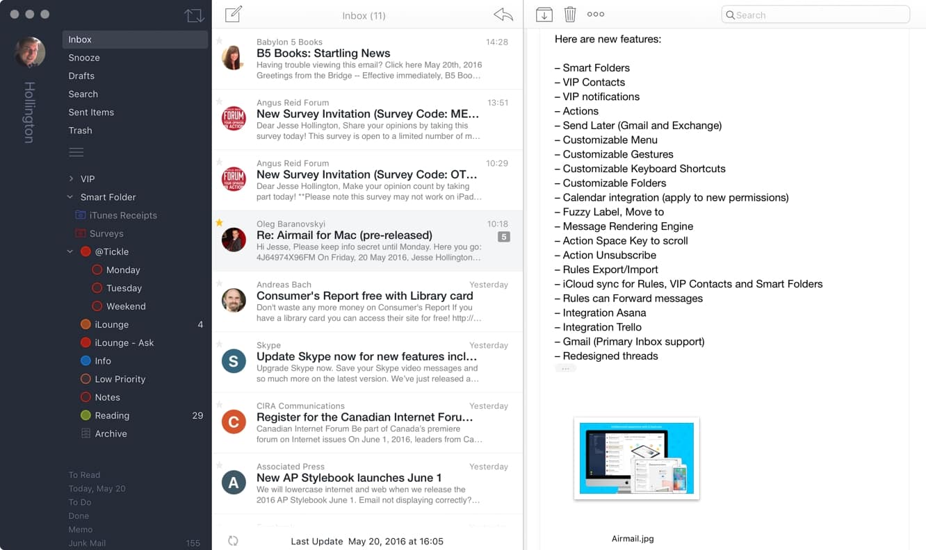 The new version also adds support for VIP contacts and VIP notifications — something that the iOS version has had since the beginning but was conspicuously absent from the Mac side until now — and of course VIP lists will sync seamlessly between the iOS and Mac versions via iCloud, along with rules and Smart Folders. Rules can also now be configured to forward messages, and Send Later support has been added for Gmail and Exchange users, allowing you to delay the sending of an email to a future date and time. Menus, gestures, keyboard shortcuts, and folders can now all be customized, rules can be exported and imported, and new actions allow you to easily unsubscribe from mailing lists.