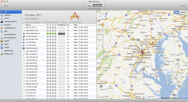 Broken down into either day or month views, you can see every single source, followed by the ratings for Trustworthiness, Vendor Reliability, Privacy, and Child Safety. It even shows you a map of the actual physical location where the connection is going—Seattle seems to be a big one.
