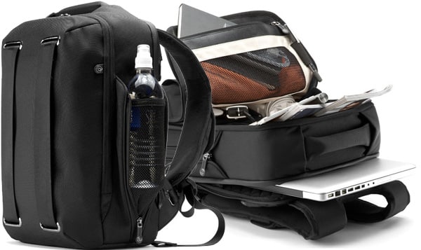 The bag is made out of ballistic nylon with a waterproof coating, so it’s designed to stand up to the elements. There’s room for either a 15” or 17” MacBook Pro in the dedicated laptop rigid-frame compartment, and of course there are plenty of other pockets for all your other goodies. In fact, the interior layout is optimized for notebook computer accessories.