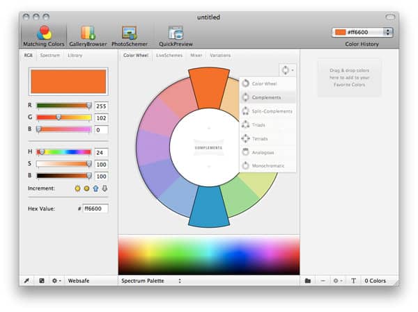 The app offers a host of ways to pick your colors—using a local color wheel, mixer, or browser, browsing though over a million schemes from COLOURlovers.com, or importing a photo and extracting the colors within. Color sets can be saved or exported in a variety of formats, and can be dragged over into “QuickPreview” windows to see them set on a pre-made layout.