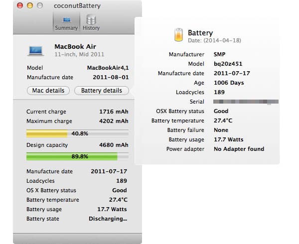 Launch coconutBattery, and it’ll instantly display the current charge as a percentage as well as in miliampere-hour, or mAh. You’ll also see the maximum charge level, rated against the battery’s original capacity.