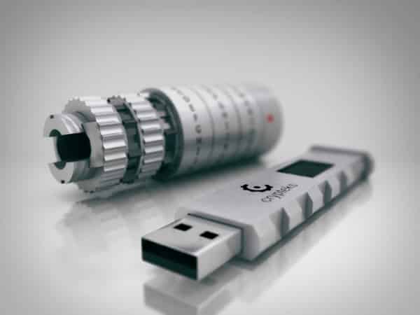 Crypteks USB has five rings on the outside that can be set to any password you’d like; there are 14,348,907 combinations.