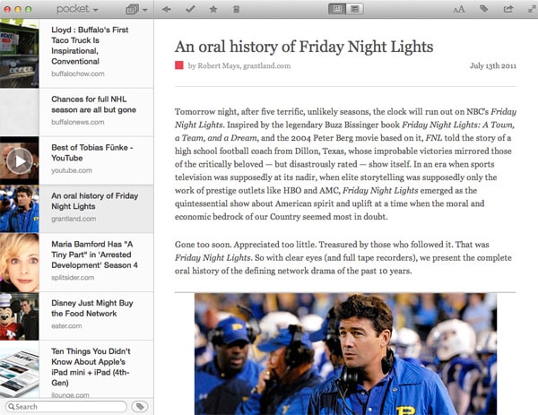 Formerly known as Read It Later, the service came to iOS with a truly great app updated in April 2012, and is now available for free in the Mac App Store.