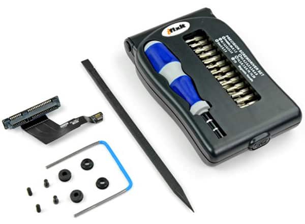 Inside the Dual Hard Drive Kit are a proprietary SATA hard drive cable, shock-absorbing mounting grommets, mounting screws, a Mac mini Logic Board removal tool, a 26-piece bit drive kit, and a spudger to open the computer.