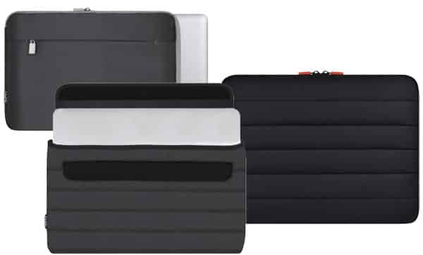 SFO has an envelope-style setup, with a black or graphite quilted body that has extra padding for protection. The front flap closes with Velcro designed to provide an extra secure closure. For MacBook Pros, DEN also is a puffy, quilted sleeve but rather than looking like an envelope, it features dual zippers along the top edge.
