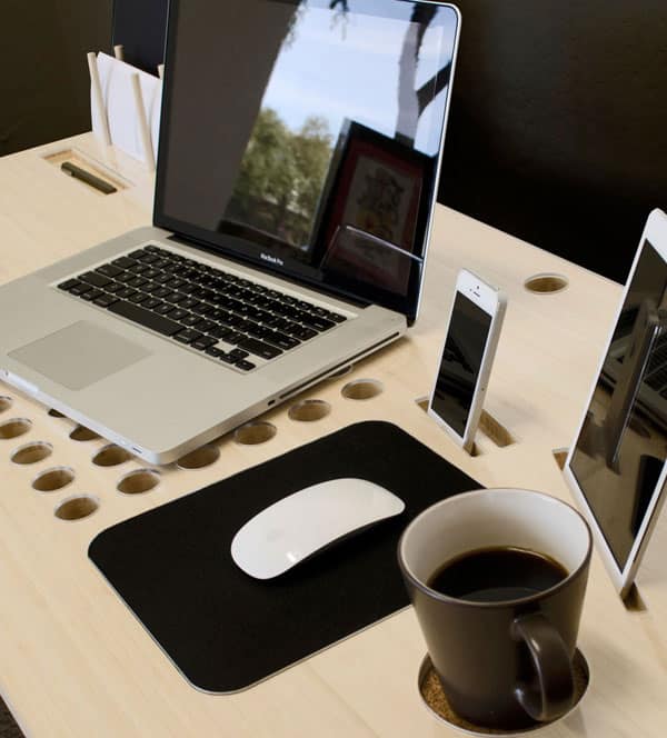 There’s also a cutout for a mug or bottle, docks for iPhones and iPads through which cables can be strung, a filing rack, and a pen dock. Simply put, it makes sense.