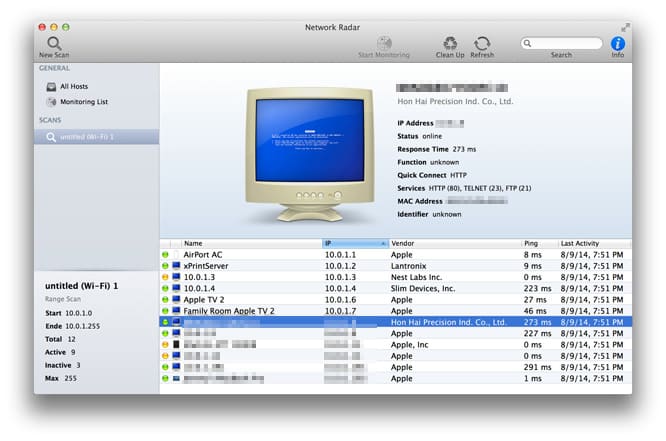Diagnosing problems with your Mac’s wireless network can be seriously challenging — average users can’t hope to master the science of examining individual devices for issues, or getting a big picture sense of how everything’s working together. Mac Attender’s Network Radar ($20) isn’t the least expensive way to help you tackle network issues, but it’s the best-designed option we’ve seen. After you choose a wireless or wired network to scan, it presents you with a list of green/yellow/red status devices, their IP addresses, vendor information, ping speeds, and last activity times.