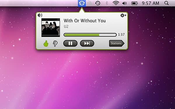 Right from the menu bar, you can get access to all of the stations you have set up on your free or paid Pandora account. You’re able to control playback and rate songs with a thumbs up/thumbs down—the newest update lets you rate with your Apple Remote too, if you have one.