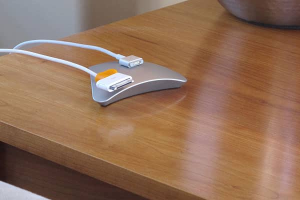 The top surface of the accessory is magnetic, allowing compatible cables to latch right on and stay in place. For Mac users, this is specifically handy for grasping an unused MagSafe connector. For Lightning cables or anything else that isn’t magnetic, you get three magnetic cable ties that be wrapped around to hold them down.