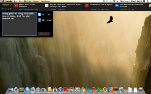 Some people get their news by visiting sites multiple times throughout the day. Others use RSS readers to stay up to date. With its eponymous app, Retickr (Free) presents a third option: it’s a scrolling ticker that runs across your Mac’s screen with the stories that you care about.