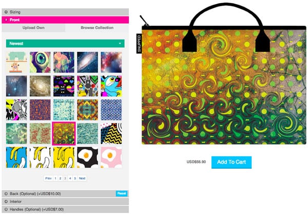 By default, the front and back get the same image, but you can pay $10 more to have different pictures. For free, you can choose the interior color, while optional handles cost $7.