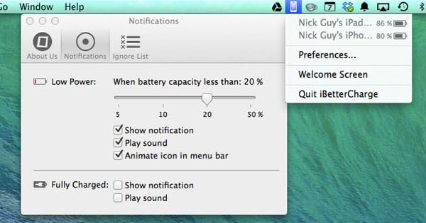 iBetterCharge doesn’t require any sort of additional set up. As long as your iPad, iPhone, or iPod touch is set to backup over WiFi, it’ll show up in the menu bar drop-down list, displaying its current charge level. Then, when it reaches whatever percentage you choose, the app will play a sound, an animation, or show a notification.