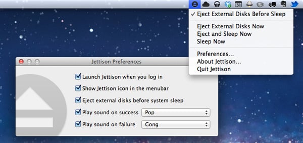 St. Clair Software’s Jettison ($2) is one of those apps that offers a feature you’d think would already be baked into OS X, but is missing for one reason or another. In this case, it’s automatic ejection of external disks.