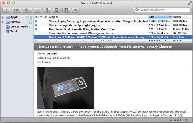 Designed specifically for OS X, Vienna is an elegant tool that provides quick access to articles and posts from all your favorite sites. It looks like Apple’s Mail app, with a narrow main feed on the left column, and two rows on the right.