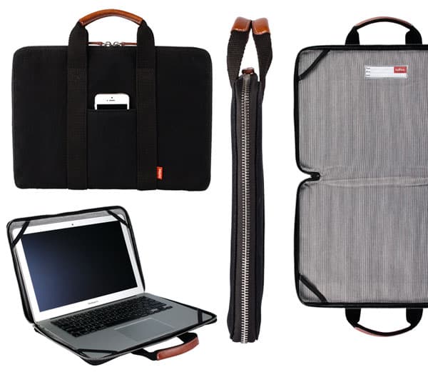 Four straps inside fit around the corners of your Mac, holding it place, and the rest of the bag zips shut around it. Vegetable-tanned leather handstraps make the bag easy to carry, and there’s even a pocket for your iPhone on the front.