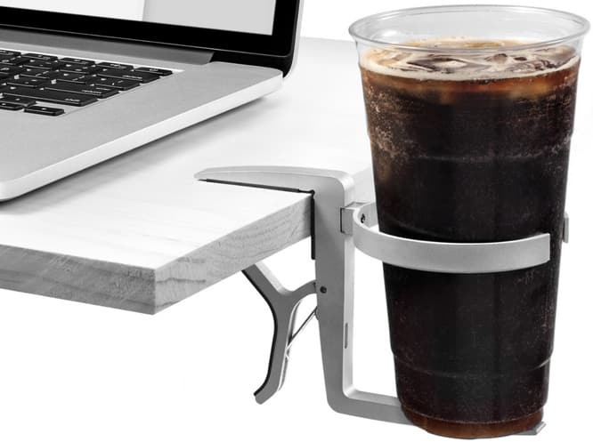 On the backside, there’s a clamp that’s padded with rubber on the inner edges. Snap it on, and you’re good to go. It can hold mugs, to-go cups, cans of pop, and even those little airplane cups. We don’t necessarily buy the marketing about saving your computer from spills, but it’s still useful, especially for those with small desks, and the Mac-matching finish is a plus.