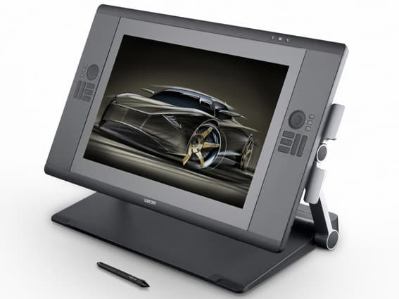 Rather than putting users in the awkward position of needing to reach across a desk to interact with an upright display, Cintiq 24HD comes to you whenever it’s needed: there’s an arm with 75° of range, pivoting from 2° to 77°, while the display itself moves between 88° and 165°.