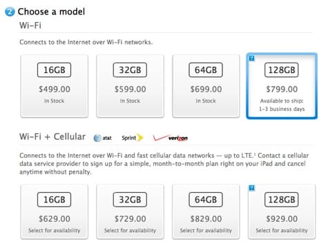 The Wi-Fi iPad is available to ship in one to three business days, while the Wi-Fi + Cellular iPad availability differs based on the network carrier — AT&T is currently showing a shipping time of one to three business days for the black 128GB iPad and three to five days for the white version, while Sprint and Verizon are both showing shipping times of three to five business days for both models.