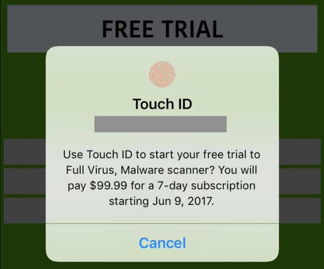 Pressing the “Secure Internet” option — theoretically what people download the app to do — leads to a game pop-up ad and then to a “Free Trial” button that actually leads to a Touch ID prompt that will enroll the user in a $100-per-week subscription for a virus scanning service the app isn’t even able to provide because of how Apple sandboxes third-party apps.