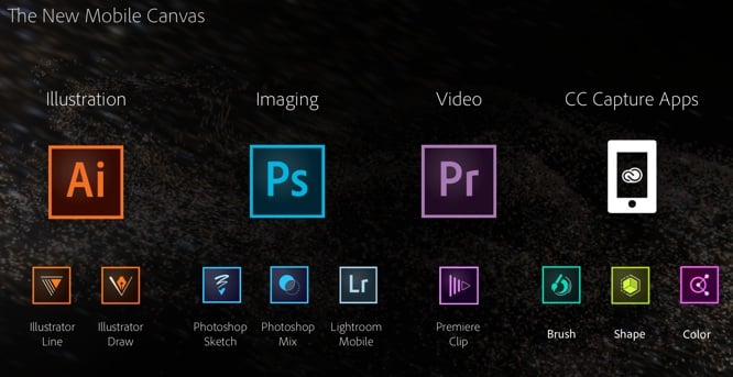 Adobe’s Creative Cloud Capture apps include: Adobe Brush CC, Adobe Shape CC, and Adobe Color CC. The design and illustration category features Adobe Illustrator Draw and Adobe Illustrator Line.
