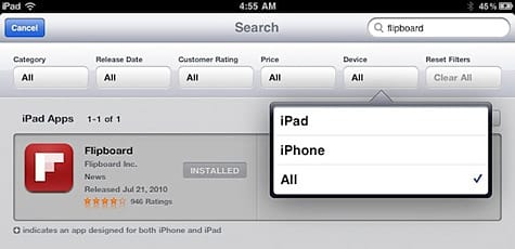 Apple has made several notable changes to the App Store interface on the iPad. When searching for an item or term, new filter buttons appear as a toolbar at the top of the results page, allowing users to filter the results by category, release date, customer rating, price, and device compatibility, reports Macstories.
