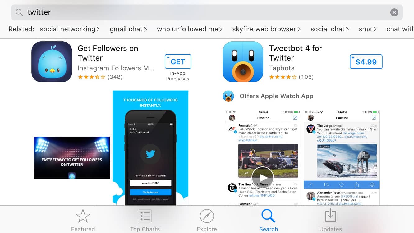 A search for “Twitter,” for example, now returns results for Twitter clients Tweetbot and Twitterrific, where both apps were recently not displayed in those search results at all despite serving the same basic function as Twitter’s own app. Apple hasn’t commented on the change, and how the move will affect app downloads and sales is still unclear.