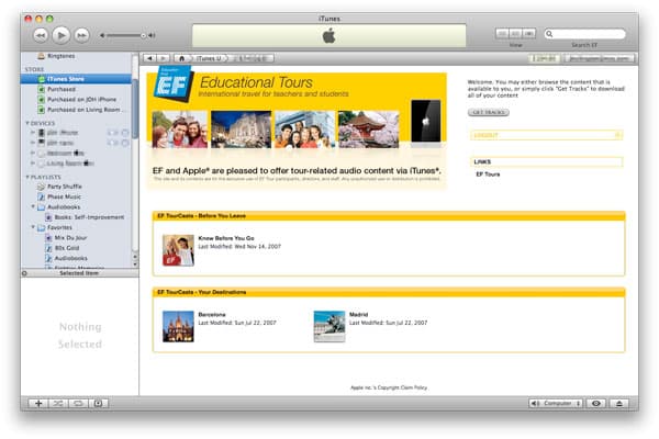 In the Education First Educational Tours example here, a user registered with an international travel tour is provided access to TourCast audio and video tracks through the iTunes U section of the iTunes Store. Unusually, the private page features an image of a touchscreen iPod/iPhone-style device with curves and a Home button-pressing dock never seen before; it is unclear whether this is meant to generically suggest iPod and iPhone compatibility, or represents a yet-to-be-announced Apple product.