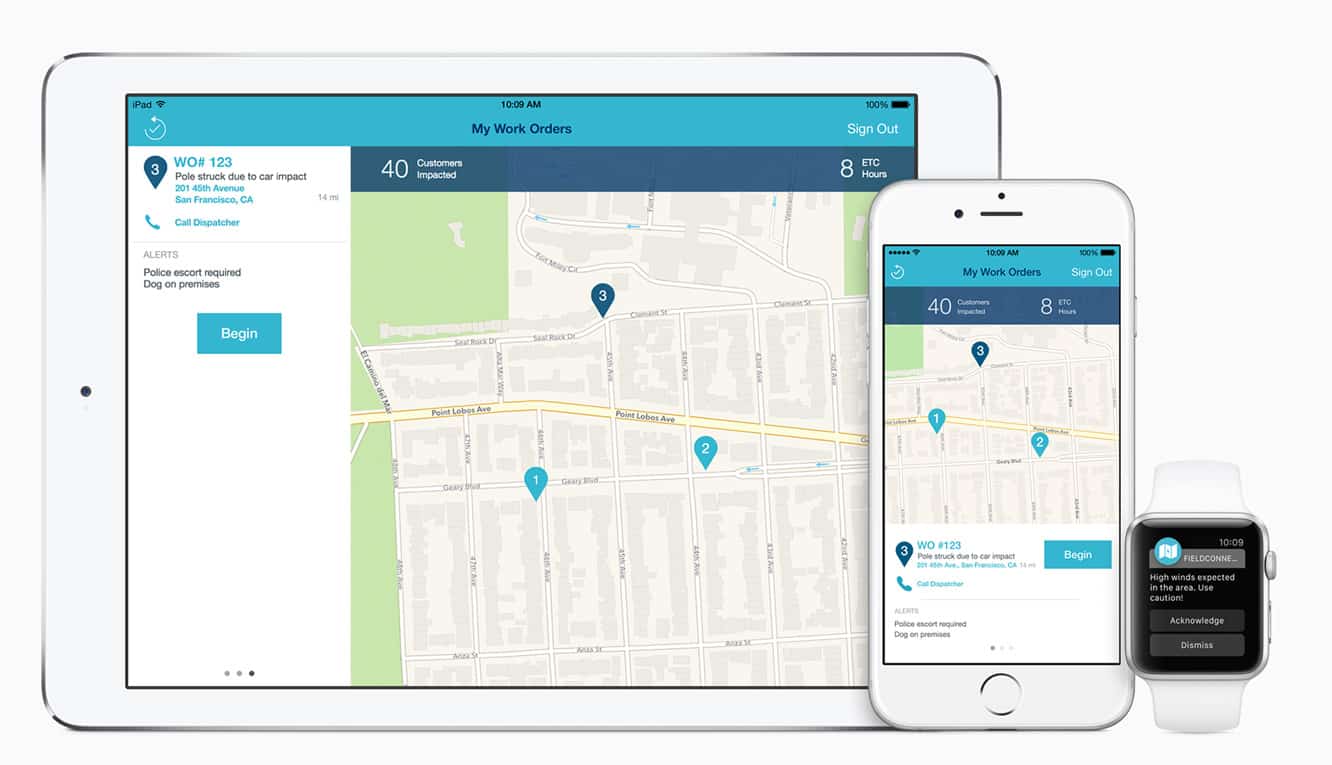 Hospital RN allows notifications to be sent to the Apple Watch to alert “nurses to review new patient requests, changes in lab status, safety alerts, and prioritized task lists for immediate action. And Apple Watch lets nurses quickly view notifications so they can stay more focused on patient care.” Field Connect (pictured above) sends notifications to field technicians of “late-breaking news on severe weather, outages, hazards and crew member information” to the Apple Watch, so “field technicians can view important alerts, without stopping what they’re doing.” Incident Aware allows police and other public safety workers to receive urgent alerts of emergency calls and related information right on their Apple Watch.