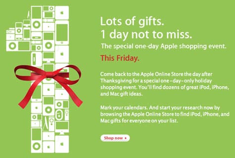 You’ll find dozens of great iPod, iPhone, and Mac gift ideas.” Exact details of the event, such as applicable products and pricing, have yet to be revealed; in addition, it is unclear whether Apple will be offering the same or similar discounts in its retail stores, as well.