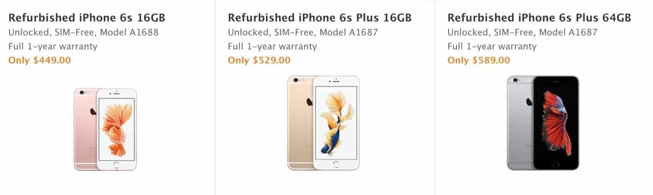 A variety of colors and capacities are available, with prices starting at $449 for a 16GB iPhone 6s — about $100 less expensive than a brand new entry-level iPhone 6s, although it’s worth keeping in mind that Apple has doubled storage capacities on this year’s iPhone 6s and iPhone 6s Plus models, making the refurbished iPhones arguably less of a deal — a brand new 32GB iPhone 6s sells for $549.