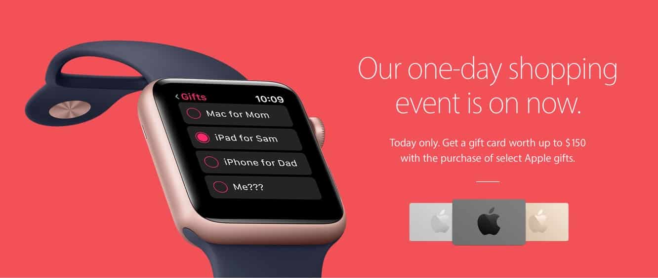 Apple is including a $150 gift card for customers purchasing a Mac, $100 for the iPad Pro, $50 for the iPad Air 2, iPad mini 4, iPhone 6s, and iPhone 6s Plus, and iPhone SE, and $25 Apple Watch Series 1, and fourth-generation Apple TV. Notably, Apple’s most recent product releases — such as the iPhone 7, iPhone 7 Plus, Apple Watch Series 2, and new MacBook Pro models — are not eligible for the gift card promotion, and refurbished and educationally-priced products do not qualify.