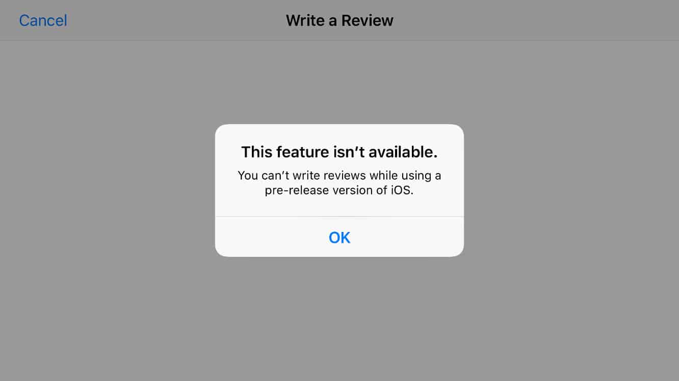 Apple likely didn’t consider the issue a problem when developers were the only ones running a beta version of iOS, but with beta iOS versions being released to the public since March, it’s possible those less knowledgeable users don’t realize that many apps haven’t been designed to run with that software. Beta users trying to leave a review will now be met with a pop-up telling them that the feature isn’t available.