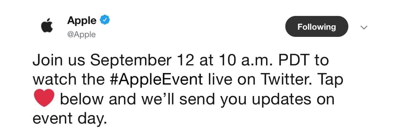 Apple has confirmed that it will be live streaming tomorrow’s iPhone launch event on Twitter, following speculation that was fuelled by a promoted Tweet that has been making the rounds. While Apple has announced its events via Twitter in the past, this is the first year the company has outright suggested a live stream on the social media service, with the Tweet noting users can “watch the #AppleEvent live on Twitter.” Apple has confirmed both to MacRumors and TechCrunch that this does indeed mean that the entire keynote will be live streamed on Twitter, in addition to Apple’s usual live streams available via its tvOS Apple Events app and Special Events page.