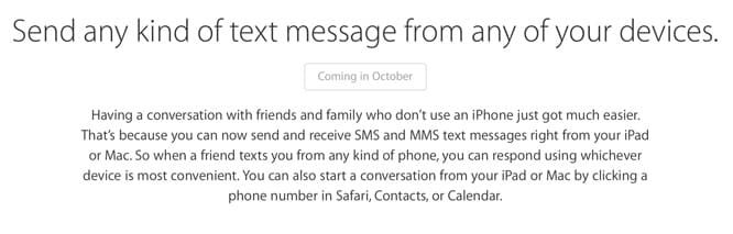 New information found on Apple’s page on iOS 8 Continuity suggests that the company may be delaying the activation of the iOS 8 SMS Continuity feature until some time in October, possibly to coincide with the expected release of OS X Yosemite.