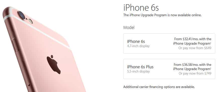 The cost is about $5 a month more than paying the carrier in installments without the option for a yearly upgrade, and the upgrade program also includes AppleCare+ protection for the user’s device. The program is available for iPhone 6s and 6s Plus, with the iPhone 6, 6 Plus or SE showing only carrier installment plans or outright purchase options.