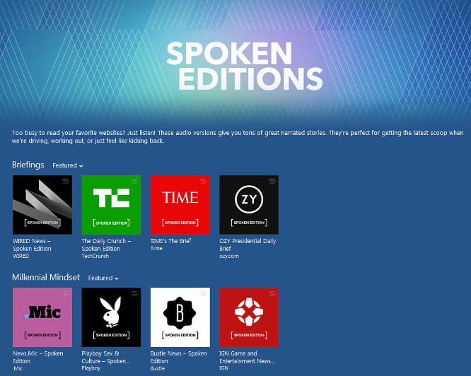 After a quick test last month, Apple has officially launched its new Spoken Editions section under the podcasts heading in iTunes. Users can now get a spoken-word version of news updates from media companies like Time, Reuters, Slate, Wired, Mic, Bustle, Jezebel, and the Huffington Post.
