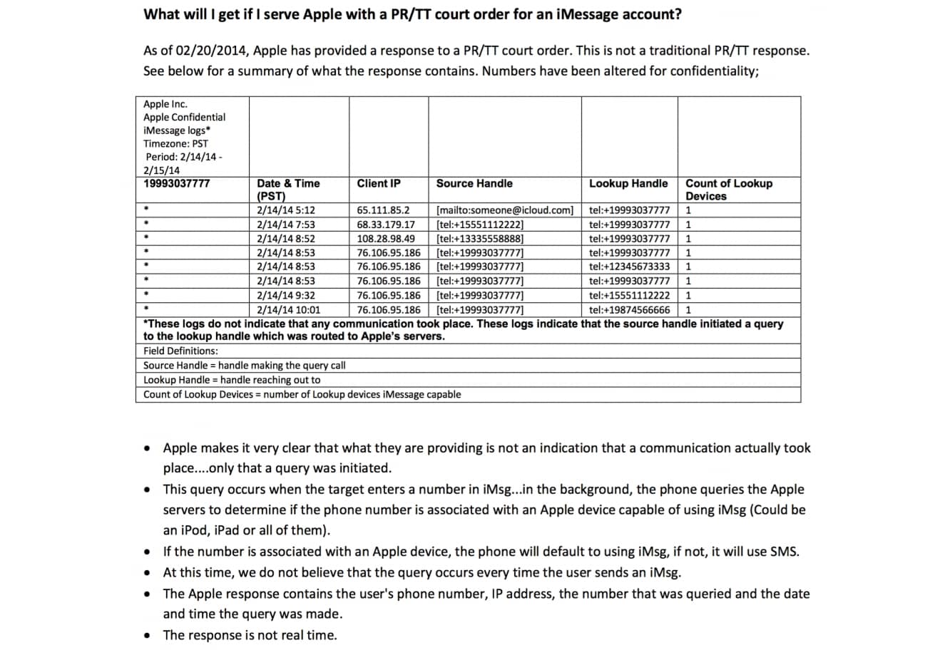 The data sample reveals source phone numbers, data and time information, IP addresses where requests originated, and the numbers being looked up. Apple also adds a disclaimer stating that “These logs do not indicate that any communication took place,” as only queries for iMessage capabilities are being logged in this case. The Intercept was unable to gain additional information as to how often such iMessage queries may be made and logged beyond the initial contact attempt; for example it’s unclear whether opening or continuing an existing iMessage conversation will log information to Apple’s servers, or if this only occurs when a new number is entered into the Messages app.