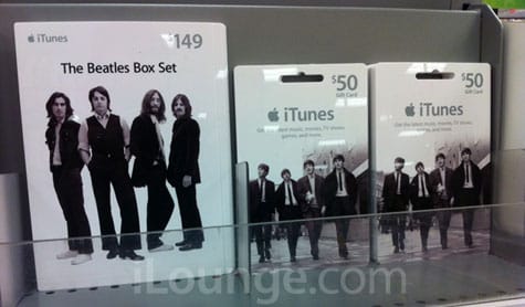 Apple has started to sell Beatles-themed iTunes Gift Cards in stores. Spotted by iLounge, one card, with a value of $149, features an image of the band members in front of a white background, with the text “The Beatles Box Set” at the top.