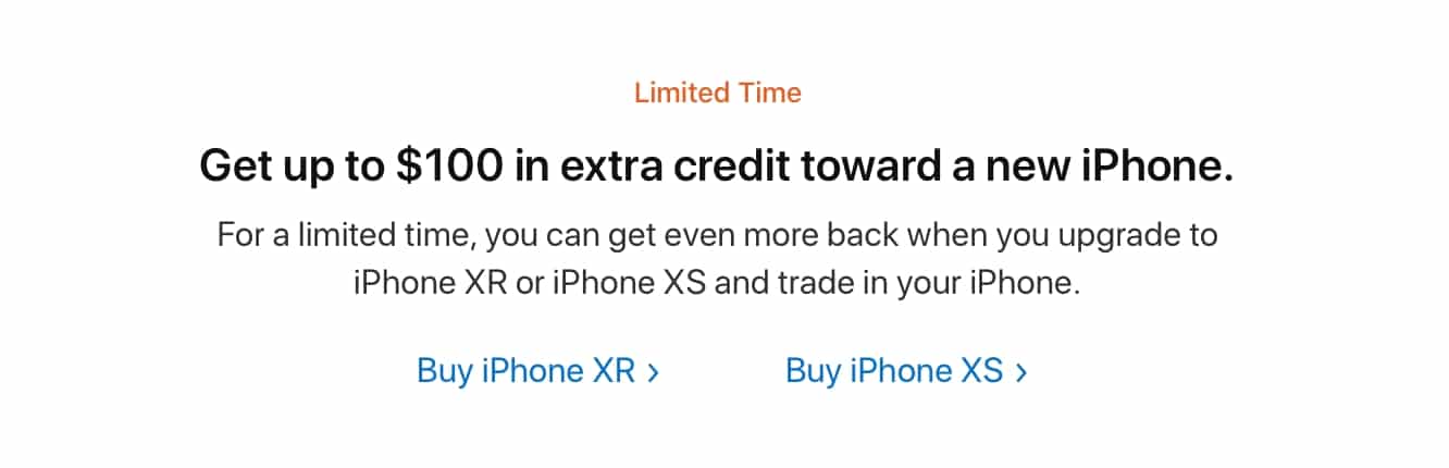 The bonus appears to be limited to purchasing only the iPhone XS, iPhone XS Max, or iPhone XR, and is not available for customers who may only be looking to upgrade to an iPhone 7 or iPhone 8 series model.