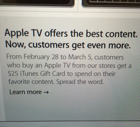 Apple retail employees have been told that anyone who purchases an Apple TV from Apple will receive a free $25 gift card starting today and ending March 5, iLounge has confirmed.