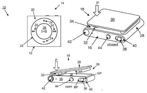 In patenting the shuffle, Apple attempts to protect a housing with “integral front and side walls that cooperate to form a cavity in cooperation with a front opening where an edge of the side walls define a rear opening and at least some of the edges have flanges.” The clip assembly and other parts are also covered at length, with some details as to how such a small device can be protected against moisture intrusion.